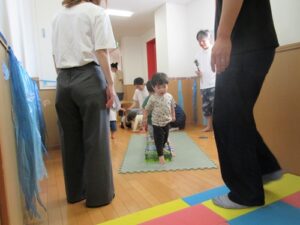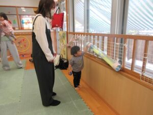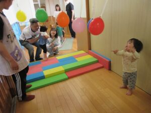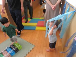 一人一人が気になった遊びのコーナーへ行き、‶みてみて″‶できた!″の表情や‶いっしょに″と手を引いて楽しんでいる姿がたくさん見られましたよ。