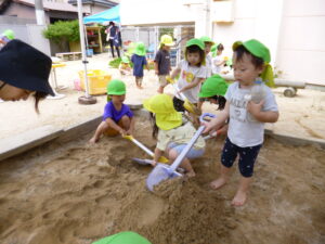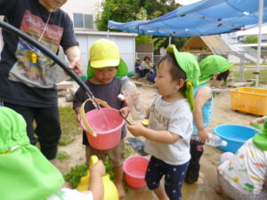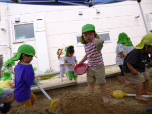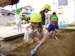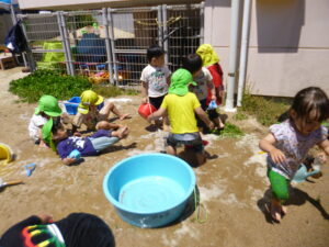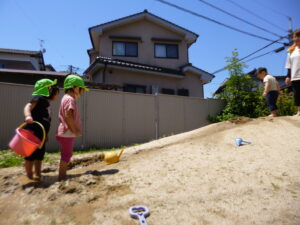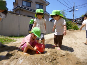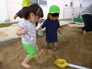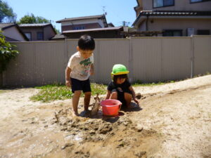 最近は、2歳児のめろん組さんが園庭でどろんこ遊びを楽しんでいます♪
