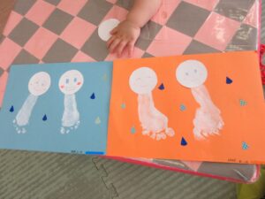 離乳食試食会が終わってから、お子さんの足型を使って‶てるてる坊主″を作っていただきましたよ。他のおうちの方と会話をしながら、可愛いてるてる坊主が出来ました♪おうちに飾って頂ければいいなと思っています✨