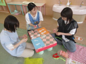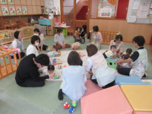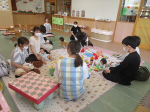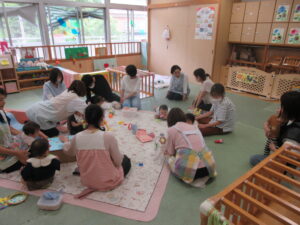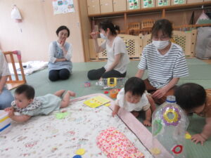初めての環境でドキドキしているお友だちでしたが、お父さんお母さんと一緒にいることに安心し、またいつも通りに遊んでいるいちご組のお友だちの姿を見て次第に表情も柔らかくなり‶これはなにかな?″とずり這いやハイハイで行きたいところへ動いていましたよ♪手作りの音の出るマラカス、オーガンジーの布やカラーボールを穴の開いたダンボールや空き容器に出し入れするなど様々な姿が見られました。