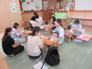 沢山遊んでお腹がすいていたのかよく食べていましたよ。お父さんお母さんにも試食をしてもらいながら、保育士や給食先生と普段の様子や食材の調理方法、お子さんの口の動きに合った食材の大きさ・形など気になることを聞いておられました。ご家庭での離乳食の参考になればと思っています♪