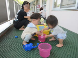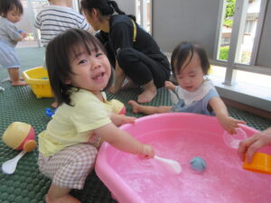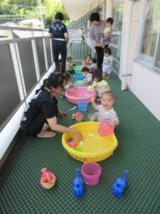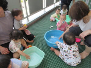 タライに水を入れてジョウロやカップ、スプーンやレンゲなどを使って水に触れて楽しみました✨