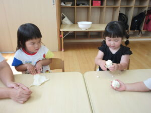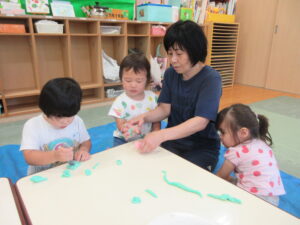 2025.07.24 こねこね ぎゅっぎゅっ🍈 「これなぁ~んだ?」と小麦粉粘土がでてくると・・ 「わぁ!なんだこれ~??」と不思議そうな子どもたち☺ こねこね よいしょっ♪ みんなも触ってみよう~ つめたいね・・やわらかいね・・ ちょっぴり色もつけてみて・・ わぁ~ケーキみたい🍰 さかなだよ~🐠 こねこね・・きもちいいね♪ 不思議な感触に触れたり見立てたりして、 小麦粉粘土あそびを楽しんだめろん組さんでした🍈 < 前の記事へ | 次の記事へ >