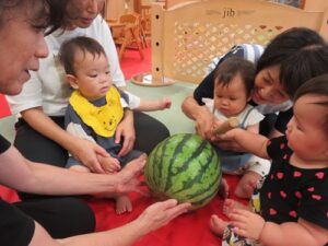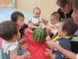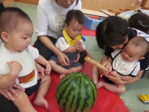 2025.07.24 いちご組さんも触ってみたよ🍉 いちご組さんのお部屋にも大きなスイカがやってきましたよ~🍉 まぁるくて大きなスイカにびっくり!! トントンっ♬かたいね~ つめたいね~ スイカ割りをやってみよう☺ われるかな~?? トントントンっ♪ 給食先生が切ってくれてみんなで食べましたよ♡ この時期ならではの季節のものにたくさん見て触れていきたいと思います。 < 前の記事へ | 次の記事へ >