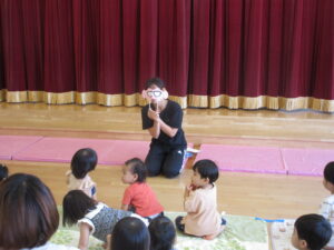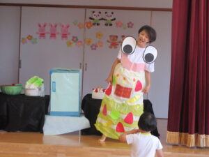 「あれあれ⁉体が~」とオバケちゃんの体が変身しててしまいました!「カキ氷オバケになっちゃった♪」変身したオバケちゃんと‶かき氷″の手遊びを一緒にしましたよ✨
