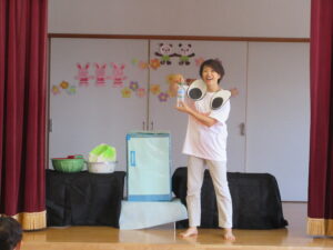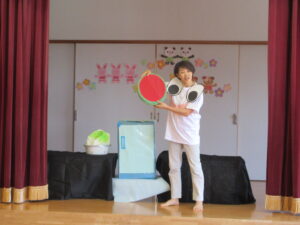 みんなが先生に「みてみて~!」と言っていると、ひょこっと可愛いオバケちゃんがステージから出てきました👻