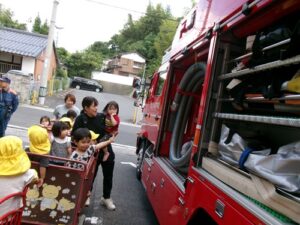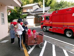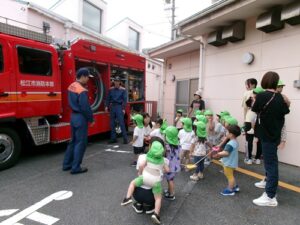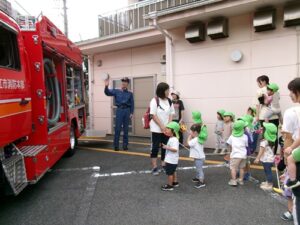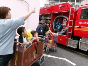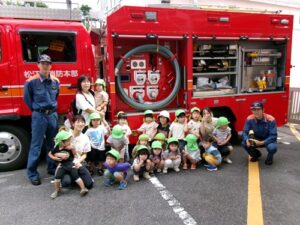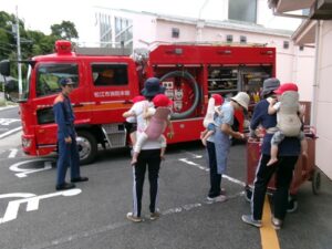 2025.09.27 消防車を見たよ🚒 9月22日、保育園に消防車が来ました✨ はたらくくるまが大好きな子どもたち! みんなで見に行きましたよ♪ みんなの大好きな赤い消防車に目をキラキラ✨ 「あっあっ!」と指をさしたり、「しょうぼうしゃ♡」「あれはなに?これは?」と興味津々でしたよ🚒 消防車をバックに写真も撮ったよ✨ 消防車見せてくれてありがとう~♪ 消防士さんとタッチもしたよ✨ 消防車さんまたね~♪バイバ~イ! < 前の記事へ | 次の記事へ >
