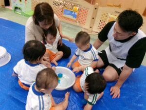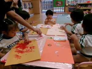 にぎにぎ...ぺたぺた..♪手や足で寒天や絵の具に触れたり、画用紙にペタッとスタンプをして楽しみましたよ。