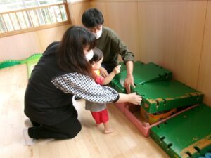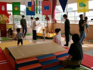 遊戯室では、トンネルや段ボールの斜面、フープ付きマットなどたくさんのコーナーがありました。