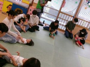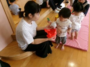 『らららだいこん』や『かもつれっしゃ』など歌に合わせて触れてもらったり、一緒に体を動かして楽しみました!