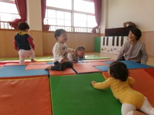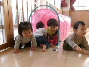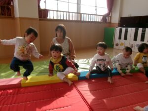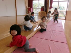 いちご組さんがはいはいで階段を上って、