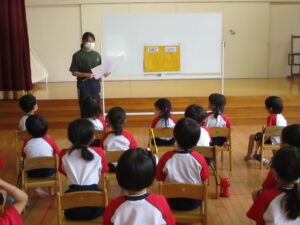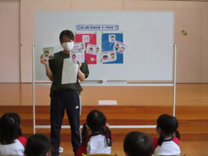給食の先生が虫歯のことやはみがきの大切さについてお話してくれましたよ。