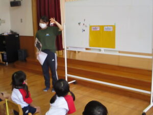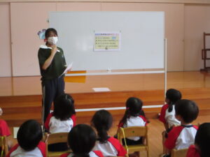 本日、給食の後で きく組、ひまわり組さんを対象に”はみがき指導”を行いました。