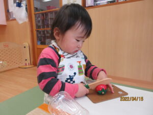 ニンジンやイチゴを包丁で上手に切れると、にっこり笑ってとても嬉しそうでしたよ。