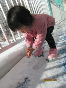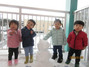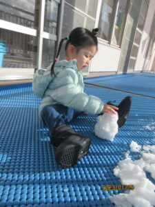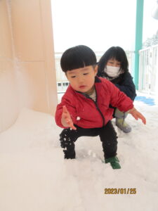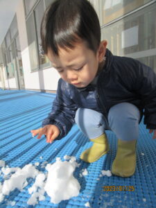 雪がたくさん降って大興奮の子ども達でした。雪に触ってみようとすると、ちょっとためらってみたり指先でつまんでみたりと最初は触ることに少し抵抗があったようです。